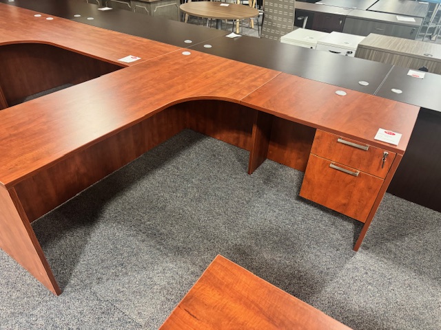 This new 72” x 72” cherry corner desk with right return creates an efficient L-shaped workspace for offices or home offices. Featuring convenient box/file drawer storage, it offers a spacious work surface, organized filing, and a classic cherry finish for a professional office setup.