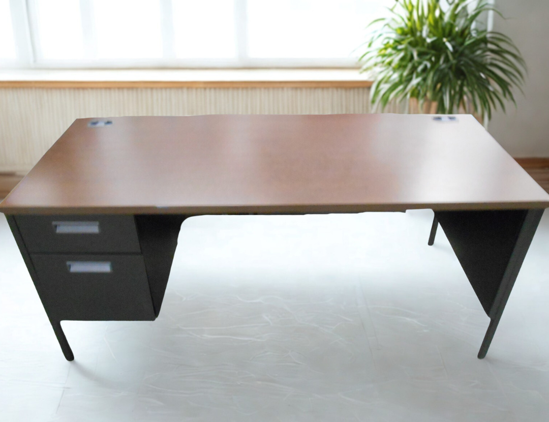 This used closeout metal desk combines a durable steel frame with a mahogany laminate top and charcoal base, offering a strong, modern workspace solution. Ideal for offices, workstations, or home offices, it delivers lasting performance, clean design, and excellent value.