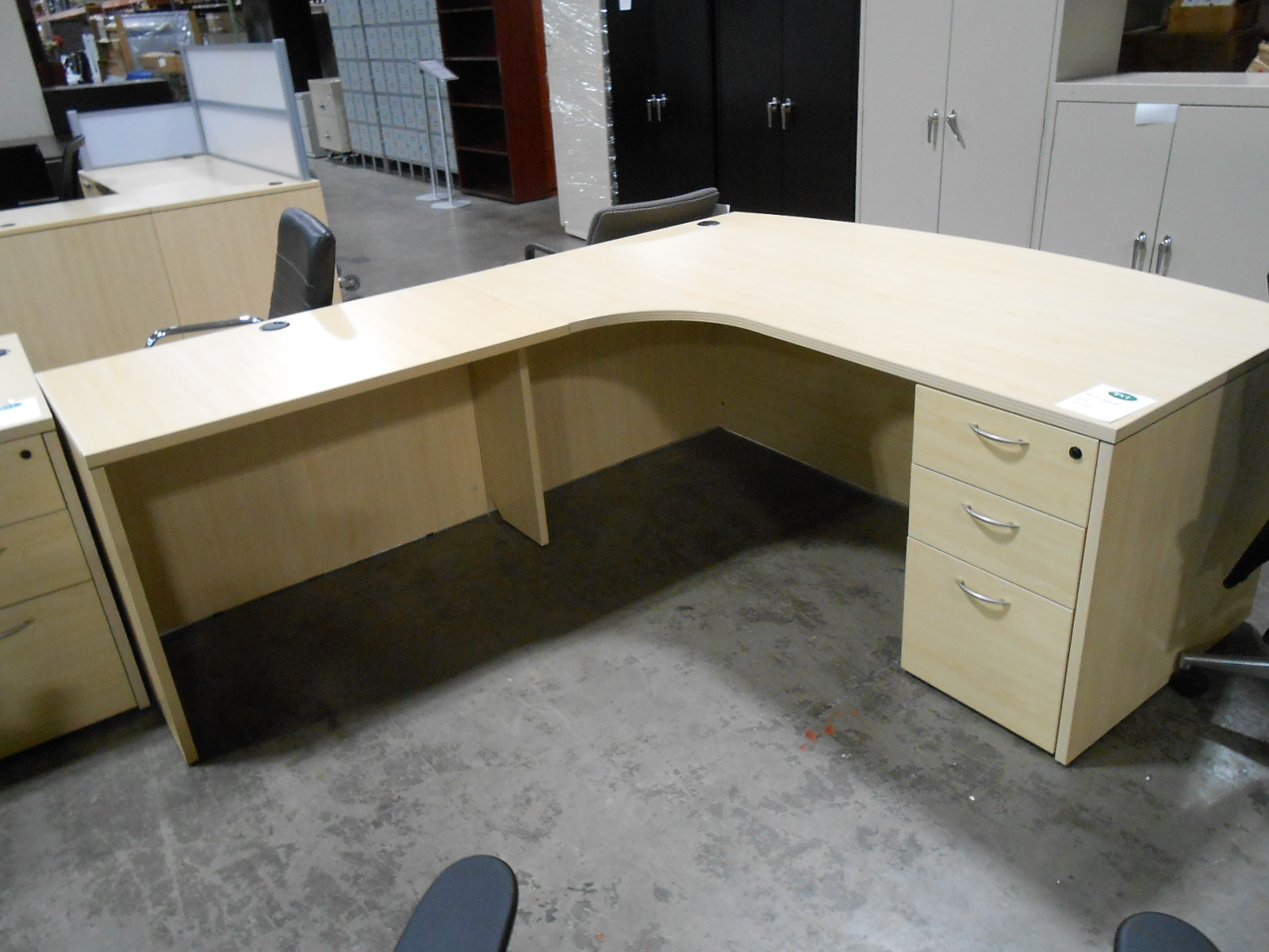 This used maple desk with left return offers an extended work surface and a clean, professional look for offices or home offices. Ideal for everyday business use, it provides a practical layout that supports organization, productivity, and value.