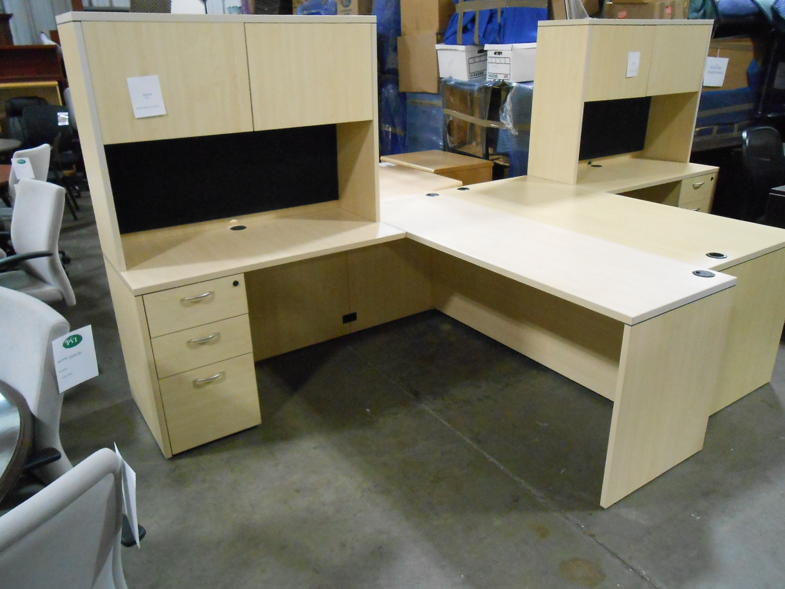 This used maple laminate desk with left return and hutch provides a functional office setup with added work surface and vertical storage. Ideal for offices or home offices, it offers organized workspace, efficient layout, and professional appeal at a great value.