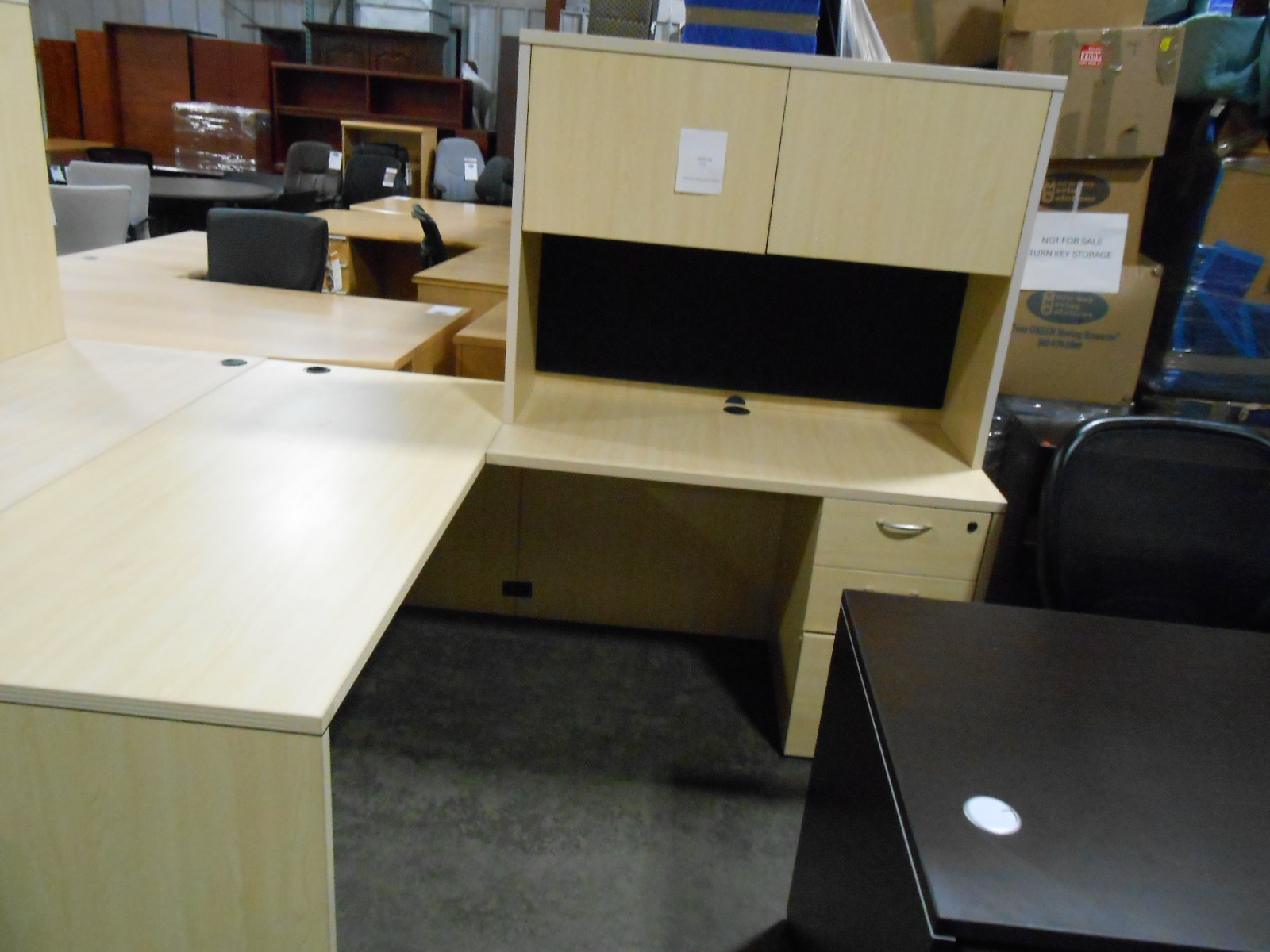 This used maple laminate desk with right return and hutch offers an expanded work area with overhead storage for a more organized office setup. Ideal for private offices or home offices, it combines practical workspace, added storage, and everyday functionality at a great value.